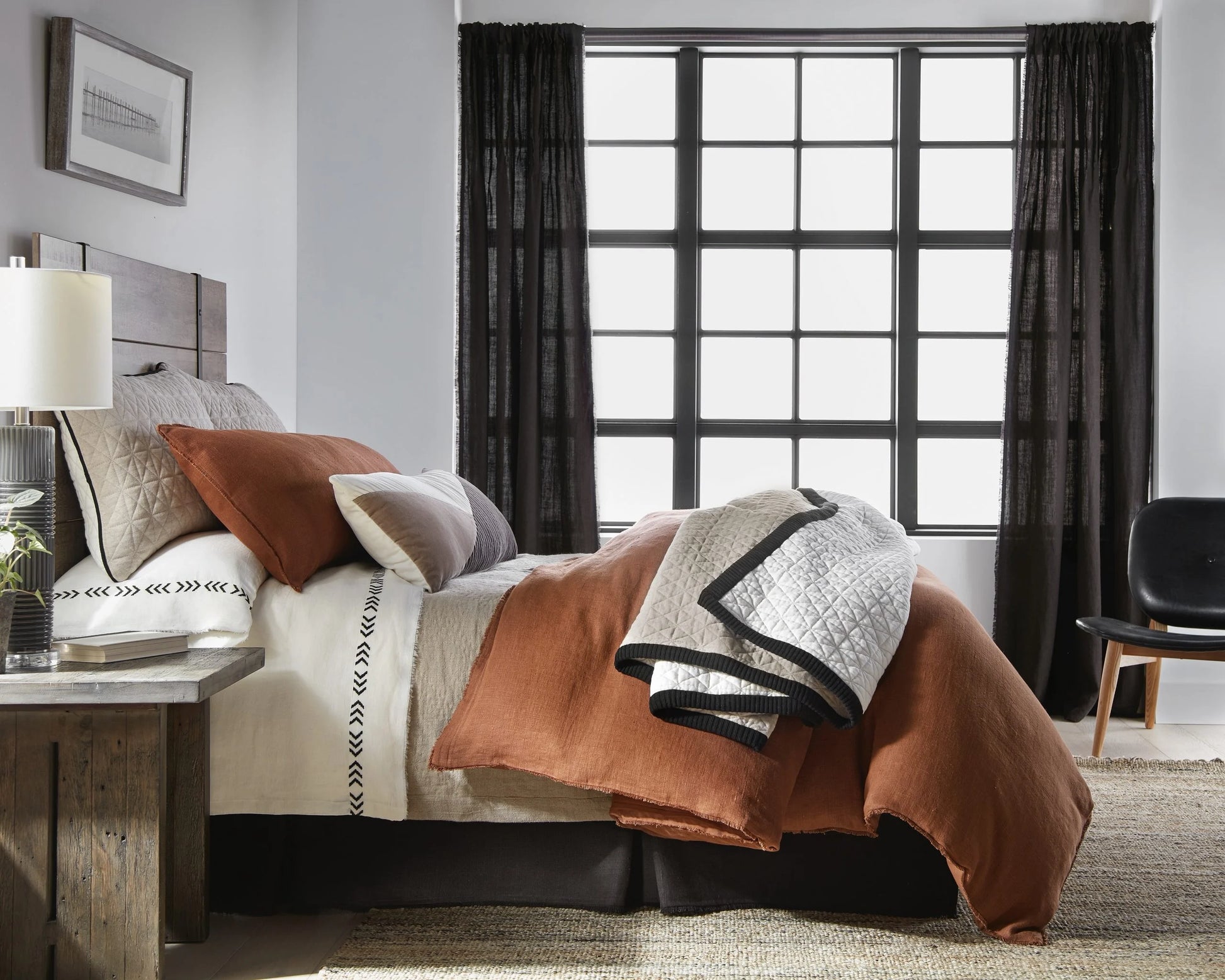 - Washed linen, casual cotton and creative details converge in this modern setting featuring our Ranier Duvet Cover and Kirk Quilt. The Ranier duvet cover and body pillow warm the setting in a rich Saddle coloration and feature a refined eyelash edge trim. The Kirk quilt is soft knit cotton that reverses from a heathered natural to ivory with a contrasting stitch, and is finished with an asphalt trim for a graphic feel. Using the Kyler quilt in natural as the first layer adds visual and physical warmth to the setting. The Kith sheet set bridges style and function. The graphic embroidery adds a refined pattern to the otherwise textural ensemble, and linen sheeting is always a luxurious choice! The Cleary XL Bolster adds just a hint of cotton velvet and another graphic pattern.