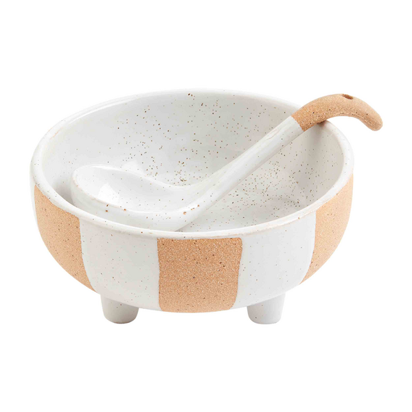 This Terracotta Salsa Bowl Set features white glazed patterns. The two piece set comes with a glazed and exposed terracotta salsa bowl. The bowl also comes with a coordinating ladle. The salsa bowl features a striped pattern that alternates between tan and white stripes.